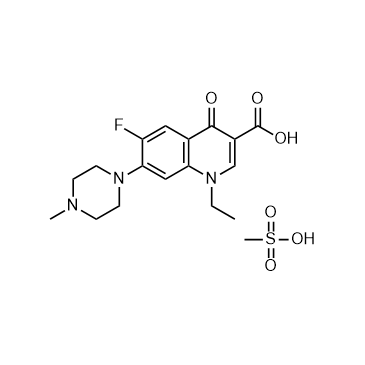 Pefloxacin mesylate (Standard) (Pefloxacinium mesylate (Standard)) is the analytical standard of Pefloxacin mesylate (HY-B0147A). This product is intended for research and analytical applications. Pefloxacin (Pefloxacinium) mesylate is a broad spectrum antibiotic. Pefloxacin blocks DNA replication by inhibiting DNA gyrase. Pefloxacin mesylate inhibits DNA relaxation catalyzed by topoisomerase I with an IC50 of 45 μg/mL. Pefloxacin mesylate exhibits antibacterial activity against Escherichia coli, Pseudomonas aeruginosa, and Bacteroides fragilis with MIC90s of 0.12, 4, and 16 mg/L, respectively. Pefloxacin mesylate has anti-Plasmodium yoelii infection activity. Pefloxacin mesylate increase UVA-induced edema and immunesuppression. Pefloxacin mesylate can be used for infection studies[1][2][3][4][5][6][7][8][9].