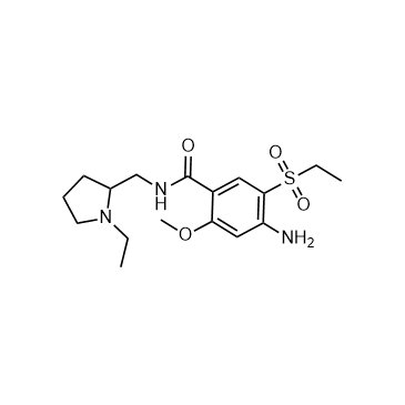 Amisulpride ((Rac)-Aramisulpride) is a racemic (50:50) mixture of the R-Amisulpride (HY-109167) and S-Amisulpride (HY-126068). Amisulpride is a dopamine D2/D3 receptor antagonist with Ki values of 2.8 and 3.2 nM for human dopamine b>D2 and b>D3, respectively. Amisulpride is a 5-HT7 receptor antagonist with a Ki of 44 nM. Amisulpride can be used in psychiatric research[1][2][3]. IC50 & Target:Ki: 2.8 nM (D2 receptor), 3.2 nM (D3 receptor)[1] In Vitro:Amisulpride is an atypical dopamine D2/D3 receptor antagonist with Kis of 2.8 and 3.2 nM for human dopamine D2 and D3, respectively. Amisulpride (100 nM) inhibits quinpirole-elicited [3H]thymidine incorporation with an IC50 value of 22±3 nM (n=3). Amisulpride slightly but significantly increases [3H]dopamine release from slices of the rat striatum (S2/S1=0.88±0.04 under control conditions, n=6; 1.04±0.08 in the presence of 100 nM Amisulpride,n=4; P<0.05) and opposes the inhibitory effects of 7-OH-DPAT in both brain areas[1]. In Vivo:Only the highest dose of Amisulpride (100 mg/kg) significantly reduces dopamine levels in the striatum or limbic system. Amisulpride significantly increases the synthesis of dopamine in the rat striatum and limbic system at doses of 20 and 100 mg/kg. Amisulpride (0.5 to 75 mg/kg) fails to provoke an additional increase in dopa accumulation in the striatum but slightly accelerates, at 75 mg/kg, dopamine synthesis in the limbic system. In comparison with vehicle-treated controls, Amisulpride (10 mg/kg) increases extracellular dopamine levels. The administration of Amisulpride (0.5 to 15 mg/kg s.c.) provokes a time- and dose-dependent increase in the stimulation-evoked dopamine release. Amisulpride decreases striatal ACh levels significantly at 30 and 100 mg/kg (87.5% and 56.3% of control levels, respectively)[1]. In both acute study, Amisulpride (70 mg/kg, p.o.) significantly increases the duration of swimming behavior [F(3,28)=45.90, p<0.01][2].