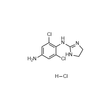 Apraclonidine hydrochloride (ALO 2145), a selective α2 and weak α1 receptor agonist activity, effectively lowers intraocular pressure (IOP) in human eyes. Apraclonidine hydrochloride is a topical ophthalmic solution and has the ability to elevate the eye lid[1][2]. In Vitro: Apraclonidine hydrochloride (ALO 2145) is more commonly used topically for glaucoma, as it penetrates the cornea and blood-brain barrier to a lesser extent and, thus, has fewer adverse systemic effects[2]. In Vivo: Apraclonidine hydrochloride (ALO 2145) is effective in animal models of elevated IOP as well as glaucoma in humans. The ocular hypotensive effects of Apraclonidine are usually attributed to reduced aqueous humor synthesis and vasoconstrictor actions at the anterior segment branches of the ophthalmic artery[2]. Apraclonidine (1.15%, single instillation) inhibits 98% of PGE2-induced aqueous flare elevationy[3].