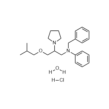 Bepridil hydrochloride hydrate ((±)-Bepridil hydrochloride hydrate) is a non-selective, long-acting Ca+ channel antagonist and Na+, K+ channel inhibitor, with antianginal and type I antiarrhythmic effects. Bepridil hydrochloride hydrate also acts as a cardiac Na+/Ca2+ exchange (NCX1) inhibitor. Bepridil hydrochloride hydrate can be used for the research of cardiovascular disorders[1][2][3][4][5].
