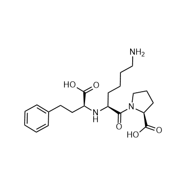Lisinopril (MK-521) is angiotensin-converting enzyme inhibitor, used in treatment of hypertension, congestive heart failure, and heart attacks. IC50 & Target: ACE. In Vitro: Lisinopril is a potent, competitive inhibitor of angiotensin-converting enzyme (ACE), the enzyme responsible for the conversion of angiotensin I (ATI) to angiotensin II (ATII). ATII regulates blood pressure and is a key component of the renin-angiotensin-aldosterone system (RAAS). Lisinopril may be used to treat hypertension and symptomatic congestive heart failure, to improve survival in certain individuals following myocardial infarction, and to prevent progression of renal disease in hypertensive patients with diabetes mellitus and microalbuminuria or overt nephropathy[1][2].