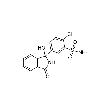 Chlorthalidone is a thiazide-like diuretic used to treat hypertension. In Vivo: Chlorthalidone is a thiazide-like diuretic. After oral intake, peak serum concentrations are achieved in 2-6 hours. The half-life of Chlorthalidone is approximately 42 (range 29-55) hours, reaching 45-60 hours after long-term dosing. However, interindividual variability in the half-life of Chlorthalidone is wide. Chlorthalidone is excreted unchanged by the kidneys. The natriuretic effect of Chlorthalidone is maximal at 18 hours and lasts more than 48 hours. Comparing different doses of Chlorthalidone, it has been observed that 25 mg daily is nearly as effective as higher doses, but with less risk of hypokalemia[1]. Chlorthalidone reduces calcium oxalate calculous recurrence but magnesium hydroxide does not. The effectiveness of Chlorthalidone or magnesium hydroxide is examined in the prevention of recurrent calcium oxalate kidney calculi. In a double-blind random allocation design daily dosages of 25 or 50 mg. Chlorthalidone, 650 or 1,300 mg. magnesium hydroxide, or an identical placebo are administered. All groups showed significantly decreased calculous events compared to the pretreatment rates. During the trial 56.1 per cent fewer calculi than predicted developed in the placebo group (p less than 0.01), whereas the groups receiving low and high dosage magnesium hydroxide showed 73.9 and 62.3 per cent fewer calculi, respectively (p less than 0.001 and less than 0.01, respectively). Chlorthalidone treatment results in a 90.1 per cent decrease from predicted rates and both dosages yielded similar results. When the treatments are compared Chlorthalidone is significantly better than the placebo or magnesium hydroxide (p less than 0.01). The large decreases in calculous events seen when placebo or ineffective therapy is given underscore the positive treatment bias that occurs when historical controls are used and they demonstrate the need for proper experimental design[2].