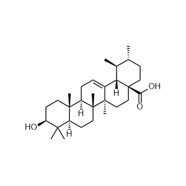 In Vivo:Ursolic acid treatment markedly improves the survival of septic rats, and attenuated CLP-induced lung injury, including reduction of lung wet/dry weight ratio, infiltration of leukocytes and proteins, myeloperoxidase activity, and malondialdehyde content. In addition, Ursolic acid significantly decreases the serum levels of tumor necrosis factor-α, interleukin-6, and interleukin-1β, inhibits the expression of inducible nitric oxide synthase and cyclooxygenase-2 in the lung, which are involved in the productions of nitric oxide and prostaglandin E2[5].
