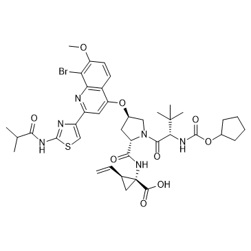 Faldaprevir (BI 201335) is a potent, orally active and selective noncovalent inhibitor of NS3/4A protease of HCV (hepatitis C virus) genotypes 1a and 1b, with Ki values of 2.6 and 2.0 nM, respectively. Faldaprevir inhibits HCV RNA replication, with EC50 values of 6.5 and 3.1 nM, respectively. Faldaprevir has potent antiviral activity against chronic HCV infection[1][2].