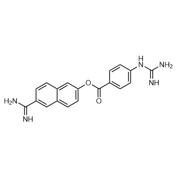 Nafamostat, an anticoagulant, is a synthetic serine protease inhibitor. Nafamostat has anticancer and antivirus effect. Nafamostat induce apoptosis by up-regulating the expression of tumor necrosis factor receptor-1 (TNFR1). Nafamostat can be used in the development of the pathological thickening of the arterial wall[1][2][3][4].