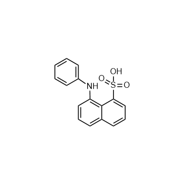ANS (8-Anilino-1-naphthalenesulfonic acid) is a competitive inhibitor targeting thyroxine binding globulin (TBG) (Ki=2.09×106 M-1). ANS is used in radioimmunoassay by displacing bound triiodothyronine (T3) to improve detection sensitivity. ANS can block the protein binding site of T3 and release free T3 for antibody recognition. As a fluorescent probe, ANS can specifically bind to the hydrophobic region of proteins (such as membrane proteins) and monitor the dynamics of protein conformation through changes in fluorescent signals. It is widely used in biochemical research and antibacterial material development[1][2].