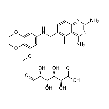 Trimetrexate glucuronate (NSC 352122) is a folic acid antagonist. Trimetrexate glucuronate affects DNA and RNA synthesis by inhibiting dihydrofolate reductase and preventing the synthesis of purine nucleotides and thymidylate. Trimetrexate glucuronate has potential antitumour activity and can also be used to inhibit Pneumocystis carinii pneumonia[1][2].