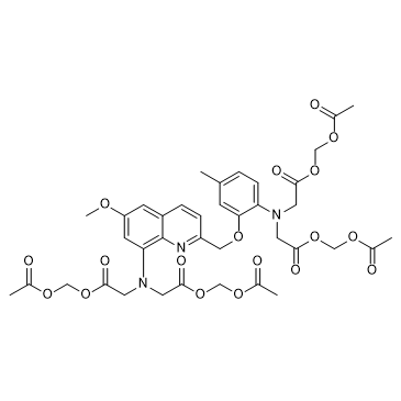 Quin-2AM is a fluorecent Ca2+ chelator, with high affinity for calcium. Quin-2AM can specifically identify intracellular calcium ions, with high sensitivity, low cytotoxicity, increased AM acetylmethyl ester can enter the cell well, after being sheared by the intracellular esterase stay in the cell to bind to calcium ions, produce strong fluorescence[1].