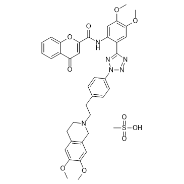 Encequidar mesylate (HM30181 mesylate; HM30181A mesylate) is a competitive and potent P-glycoprotein inhibitor. IC50 & Target: P-glycoprotein[1][2]. In Vitro: Treatment of 0.1 or 1 nM Encequidar (HM30181) lead to 20 and 42% inhibition of survival at the 100 nM and 1000 nM NSC 125973 treatment, respectively[2]. In Vivo: The plasma concentrations of Encequidar (HM30181) are higher for the simultaneous administration with the microcapsule than with the powder; providing significant differences from 1 to 2 h. The microcapsule has about a 1.7-fold faster Tmax and a 1.6-fold higher AUC value compared with the powder (2.5±0.6 vs. 4.3±0.9 h; 107.7±20.1 vs. 64.3±18.0 h ng/mL). The faster and overall improved absorption of Encequidar (HM30181) in microcapsule form might be due to the remarkable enhancement of the aqueous solubility and dissolution resulting from its crystalline conversion to the amorphous form and particle size reduction[1].