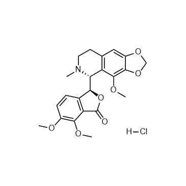 Noscapine ((S,R)-Noscapine) hydrochloride is an orally active phthalideisoquinoline alkaloid with potent antitussive. Noscapine hydrochloride exerts its antitussive effects by activating sigma opioid receptors and is a non-competitive Bradykinin inhibitor. Noscapine hydrochloride disrupts microtubule dynamics, induces mitotic arrest and apoptosis. Noscapine hydrochloride possesses anticancer, neuroprotective, anti-inflammatory activities, and can crosse the blood-brain barrier[1][2][3][4][5].