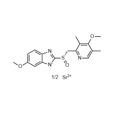 Esomeprazole ((S)-Omeprazole) hemistrontium is a potent and orally active proton pump inhibitor and reduces acid secretion through inhibition of the H+, K+-ATPase in gastric parietal cells. Esomeprazole hemistrontium has the potential for symptomatic gastroesophageal reflux disease research[1][2][3]. In Vitro: Esomeprazole (25-100 µM; 20 hours; MDA-MB-468 cells) hemistrontium treatment suppresses growth of triple-negative breast cancer cell in vitro in a dose-dependent manner through increase in their intracellular acidification[1]. In Vivo: Esomeprazole (30-300 mg/kg; oral gavage; daily; for 19 or 11 days; C57BL/6J mice) hemistrontium treatment significantly inhibits the progression of fibrosis throughout the lungs of the animals. Esomeprazole also reduces circulating markers of inflammation and fibrosis[2].