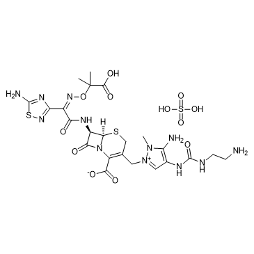 Ceftolozane (CXA-101) sulfate is an antipseudomonal cephalosporin. Ceftolozane binds to P. aeruginosa essential PBPs (1b, 1c, 2 and 3) with high affinity. Ceftolozane inhibits cell wall synthesis by binding the PBPs. Ceftolozane sulfate inhibits P. aeruginosa and Enterobacteriaceae[1][2][3][4][5][6][7].
