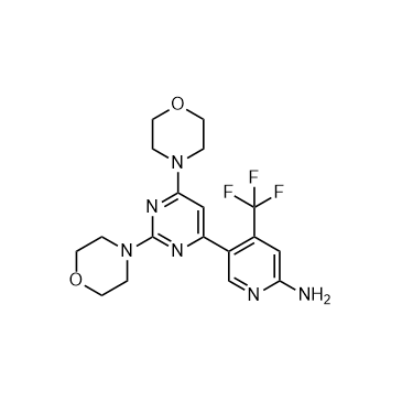 Buparlisib (BKM120; NVP-BKM120) is a pan-class I PI3K inhibitor, with IC50s of 52, 166, 116 and 262 nM for p110α, p110β, p110δ and p110γ, respectively. IC50 & Target: IC50: 52 nM (p110α), 166 nM (p110β), 116 nM (p110δ), 262 nM (p110γ)[1] In Vitro: Buparlisib (NVP-BKM120) exhibits 50-300 nM activity for class I PI3K’s, including the most common p110α mutants. Additionally, NVP-BKM120 exhibits lower potency against class III and class IV PI3K's, where 2, 5, >5, and >25 μM biochemical activity is observed for inhibition of VPS34, mTOR, DNAPK, and PI4K, respectively[1]. Buparlisib (NVP-BKM120) induces multiple myeloma (MM) cell apoptosis in both dose- and time-dependent manners. Buparlisib (NVP-BKM120) at concentrations ≥10 μM induces significant apoptosis in all tested MM cell lines at 24 h (P<0.05, compares with control). Therefore, 10 μM Buparlisib (NVP-BKM120) and 24-h treatment are chose in in the following experiments if not stated otherwise. Buparlisib (NVP-BKM120) treatment results in a dose-dependent growth inhibition in all tested MM cell lines. Buparlisib (NVP-BKM120) IC50 varies among tested MM cells. At 24 h treatment, IC50 for ARP-1, ARK, and MM.1R is between 1 and 10 μM, while IC50 for MM.1S is <1 μM, and IC50 for U266 is between 10 and 100 μM. In summary, NVP-BKM120 treatment results in MM cell growth inhibition and apoptosis in dose- and time-dependent manners[2]. In Vivo: In A2780 xenograft tumors, oral dosing of Buparlisib (NVP-BKM120) at 3, 10, 30, 60, and 100 mg/kg results in a dose dependent modulation of pAKTSer473. Partial inhibition of pAKTSer473 is observed at 3 and 10 mg/kg, and near complete inhibition is observed at doses of 30, 60, or 100 mg/kg, respectively. Inhibition of pAKT (normalized to total AKT) tracked well with both plasma and tumor drug exposure[1]. Mice receiving Buparlisib (NVP-BKM120) (5 μM per kg per day for 15 days) treatment has significantly smaller tumor burdens as compare with control mice, which are measured as tumor volume (P<0.05) and level of circulating human kappa chain (P<0.05). In addition, NVP-BKM120 treatment significantly prolongs the survival of tumor-bearing mice (P<0.05)[2].