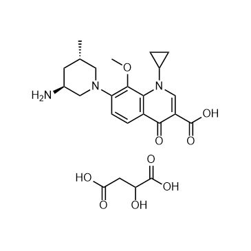 Nemonoxacin (TG-873870) malate is a nonfluorinated quinolone antibiotic. Nemonoxacin malate has broad-spectrum activity against Gram-positive, Gram-negative and atypical pathogens. Nemonoxacin malate can inhibit drug-resistant Streptococcus pneumoniae and (HY-121544) Methicillin-resistant Staphylococcus aureus. Nemonoxacin malate can be used for the research of community-acquired pneumonia[1][2].