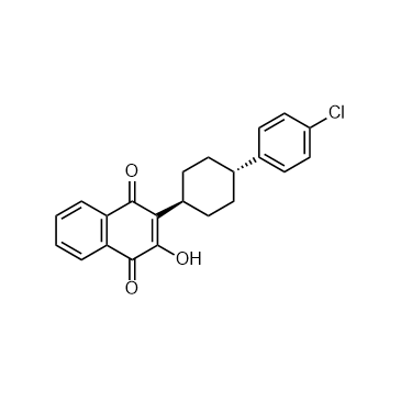 Atovaquone (Atavaquone) is a potent, selective and orally active inhibitor of the parasite’s mitochondrial cytochrome?bc1?complex. Atovaquone is against human and ?P. falciparum?cytochrome?bc1?activity with IC50 values of 460 nM and 2.0 nM, respectively. Atovaquone is an antimalarial agent and has the potential for the investigation of neumocystis pneumonia, toxoplasmosis, malaria, and babesia[1][2]. IC50 & Target: IC50: 460 nM (human?cytochrome?bc1); 2.0 nM (P. falciparum?cytochrome?bc1)[1] In Vitro: Atovaquone targets to the Qo?site of the?Plasmodium?cytochrome?bc1?complex of the mitochondrial electron transport chain[1].Atovaquone is against the development in the mosquito from gamete production, through fertilization, zygote formation and finally, to the development of the mature ookinete, and demonstrates an IC50?of 67 nM providing further evidence of the transmission blocking potential of this molecule[1]. In Vivo: Atovaquone (oral administration; 100 mg/kg; once daily) is against survival rates of mice, mice treated orally died within 22 days after discontinuation of sulfadiazine,while the control group died at day 14[2].