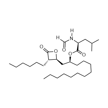 Orlistat (Tetrahydrolipstatin) is a well-known irreversible inhibitor of pancreatic and gastric lipases. Orlistat is also an inhibitor of fatty acid synthase (FASN), is used orally for long-term research of obesity[1]. Anti-atherosclerotic effect[2]. In Vitro: Orlistat (40 μM; 2 days) does not affect MGMT levels in a human melanoma cell line, but downregulates the repair protein by 30-70% in human peripheral blood mononuclear cells, in two leukemia and two colon cancer cell lines. Orlistat does not alter noticeably MGMT mRNA expression[1]. In Vivo: Orlistat (10 mg/kg/day) significantly improves lipid profile, increases antioxidant enzymes and expression of anti-inflammatory markers, and decreases the expression of the pro-inflammatory marker compared to the obese (OB) group[2].