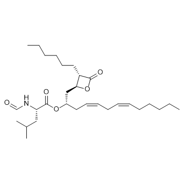 Lipstatin is a very potent pancreatic lipase inhibitor can be isolated from Streptomyces toxytricini. Lipstatin inhibits the hydrolysis of trioleate by porcine pancreatic lipase with an IC50 of 0.14 μM[1]. In Vivo:Lipstatin (20, 60 mg/kg; p.o.; single dose; 3 days) dose-dependently inhibits the absorption of triolein, whereas oleic acid is absorbed normally in mice[1].