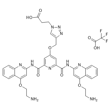 Carboxy pyridostatin trifluoroacetate salt is a G-quadruplex ligand. Carboxy pyridostatin trifluoroacetate salt has a highly molecular specificity to RNA on DNA G4s and reduces ATF-5 protein. Carboxy pyridostatin trifluoroacetate salt reduces cell proliferation and hinders stress granule (SG) formation[1][2][3].