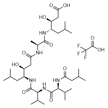 Pepstatin (Pepstatin A) Trifluoroacetate is a specific, orally active aspartic protease inhibitor produced by actinomycetes, with IC50s of 4.5 nM, 6.2 nM, 150 nM, 290 nM, 520 nM and 260 nM for hemoglobin-pepsin, hemoglobin-proctase, casein-pepsin, casein-proctase, casein-acid protease and hemoglobin-acid protease, respectively. Pepstatin Trifluoroacetate also inhibits HIV protease[1][2].