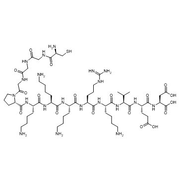 SV40 large T antigen NLS is from Large T antigen residue 47 to 55, enables protein import into cell nucleus. In Vitro: SV40 large tumor-antigen (T-ag) nuclear import is enhanced by the protein kinase CK2 (CK2) site (Ser111Ser112) flanking the nuclear localization sequence (NLS)[1]. T-ag NLS can enhance nuclear import, despite the fact that PK-C has been shown to inhibit nuclear import of proteins such as lamin B2[2].