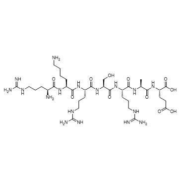 PKG Substrate is a selective substrate for cGMP-dependent protein kinase (PKG). IC50 & Target:PKG[1] In Vitro: Incorporation of [33P]ATP into the synthetic peptide PKG substrate RKRSRAE is measured. N6-benzyl-ATP inhibits kinase activity of PKG Iα gatekeeper mutants but not WT. The serotonin transporter (SERT) is responsible for reuptake of serotonin (5-hydroxytryptamine) after its exocytotic release from neurons. SERT is regulated by several processes, including a cyclic GMP signaling pathway involving nitric oxide synthase, guanylyl cyclase, and PKG[1].
